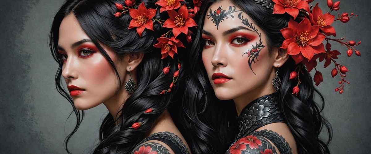 A hyper-realistic portrait of a woman with flowing black hair, red flowers, and a detailed dragon tattoo on her neck and shoulder. Fantasy digital art with cinematic lighting.