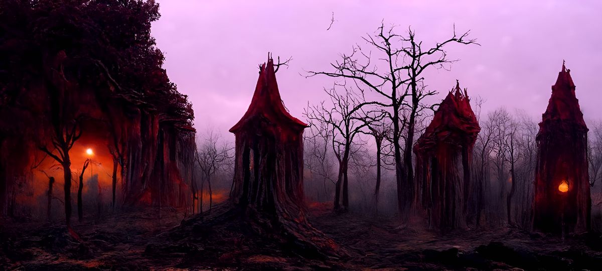 with a dark red sky the cafe lit up red by the evil moon, magic evil around