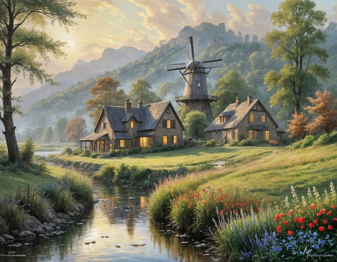 This watercolor painting captures a serene French countryside at dawn. Rolling hills, a cottage, and windmill are bathed in soft light, with mist rising from a river. Features impressionistic and highly detailed elements.