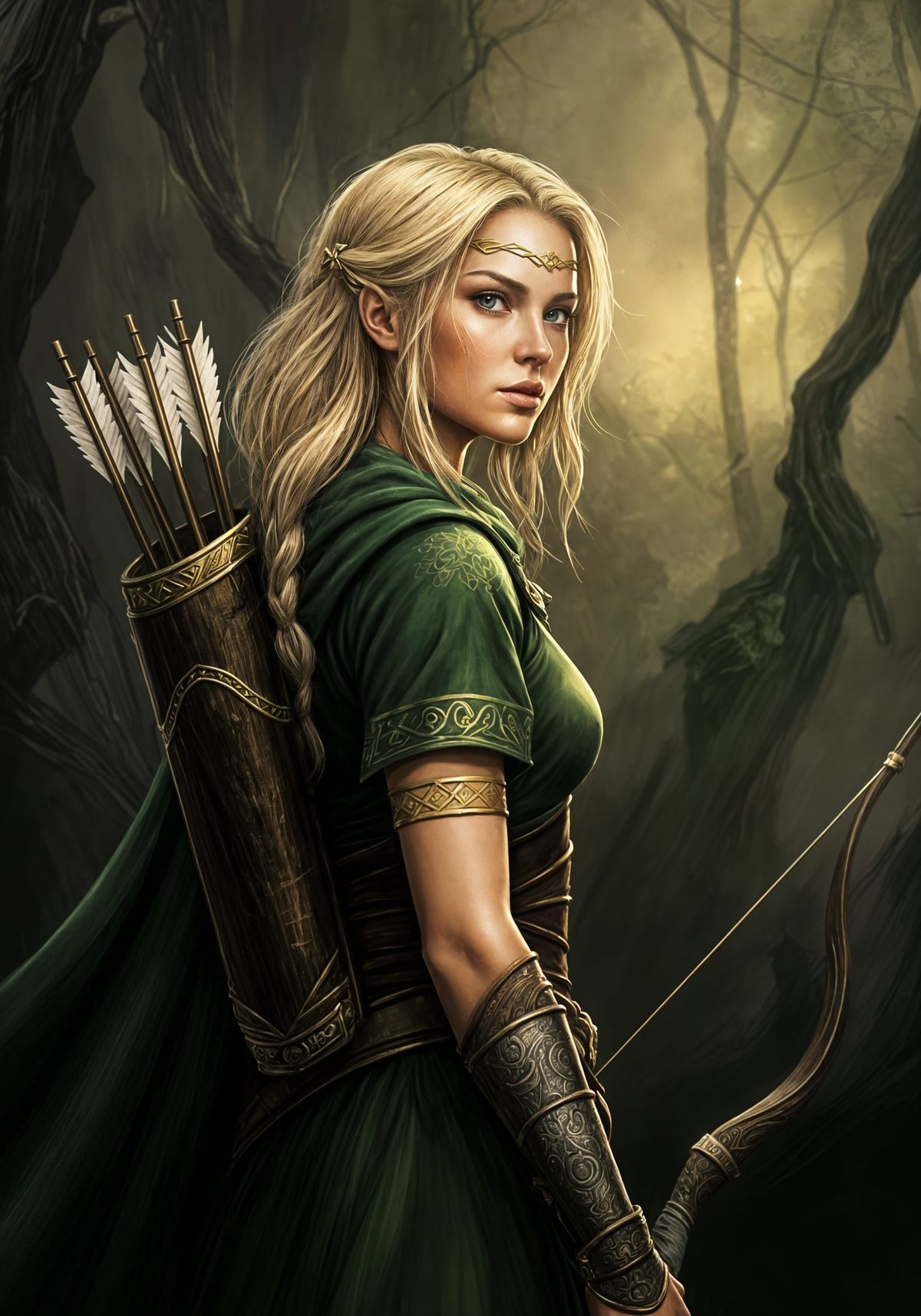 This image shows a young, blonde female hunter, dressed in a green tunic and golden accessories, as she turns to look behind her, bow and quiver at the ready. Created in a Dungeons & Dragons-inspired style, with a mix of street art and ink drawing techniques.