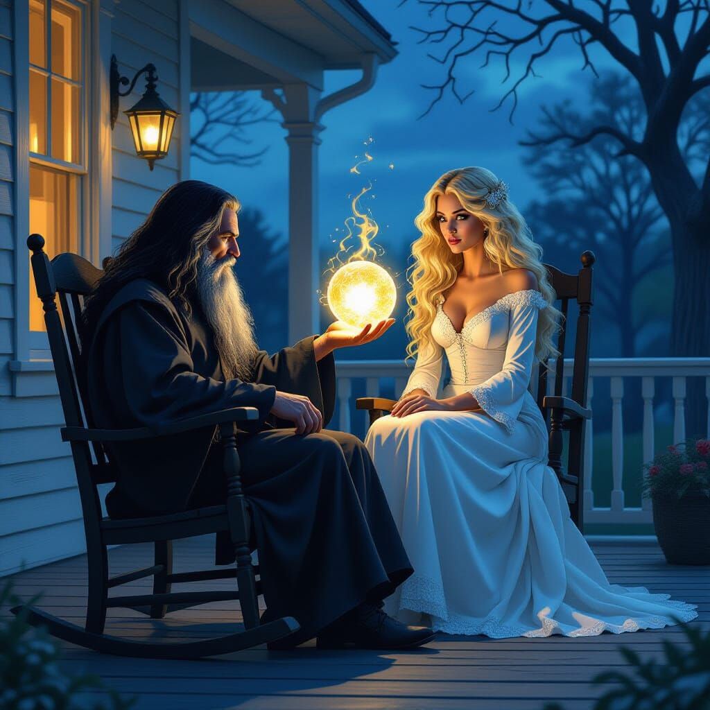 This image shows a dark wizard on a porch at dusk, gazing into a glowing orb. The vision within the orb merges dark fantasy with glitch art, creating a surreal and haunting scene.