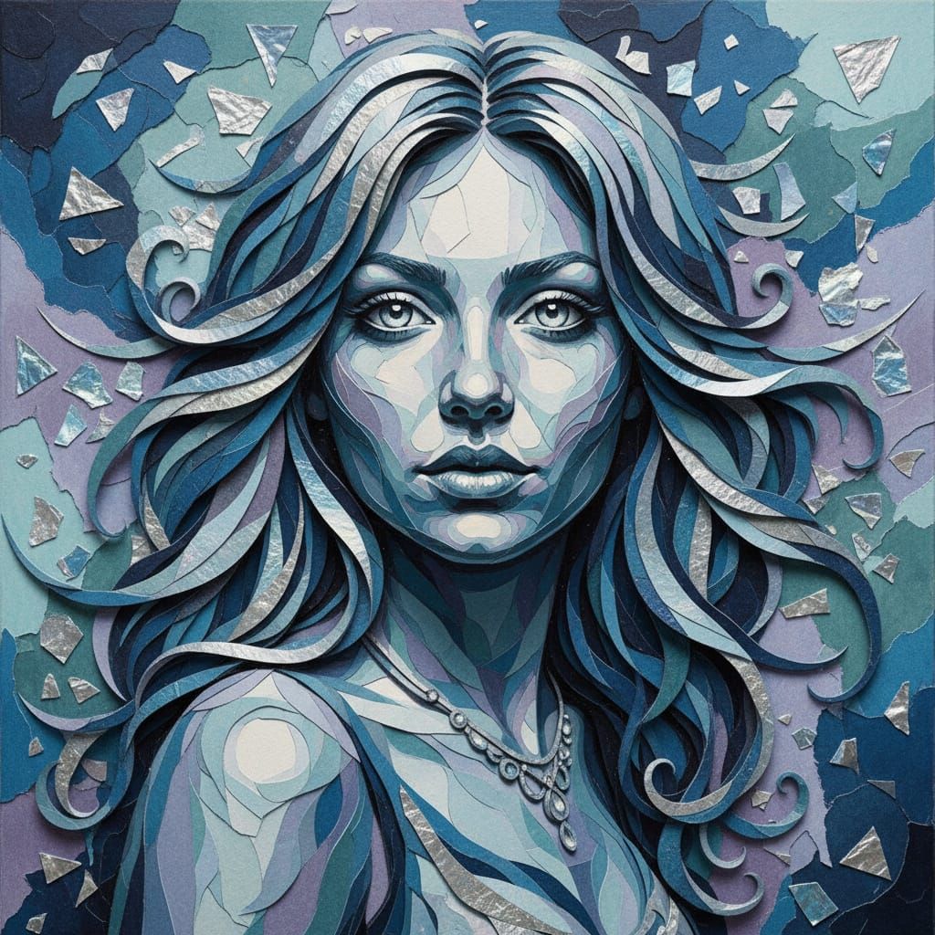 A portrait of a woman created with layered paper and iridescent foil. Cool tones, torn textures, and reflective highlights define the flowing hair and luminous eyes.