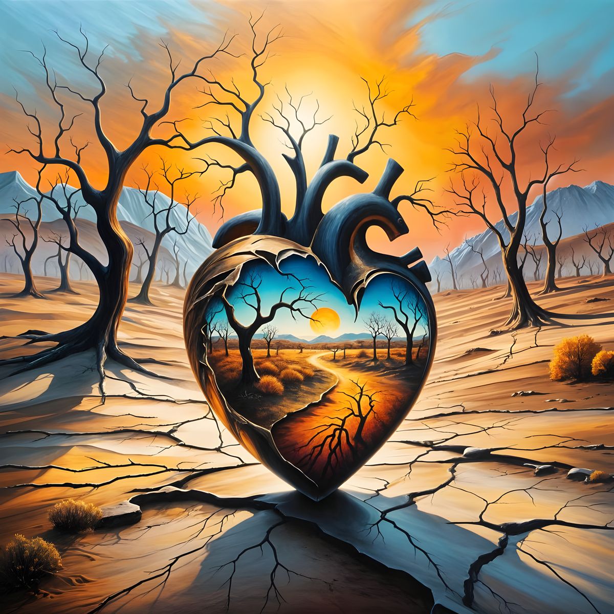 This image depicts a human heart, symbolizing emotional desolation. The matte painting style uses soft lighting and muted colors to convey a sense of detachment and the impact of separation from nature.