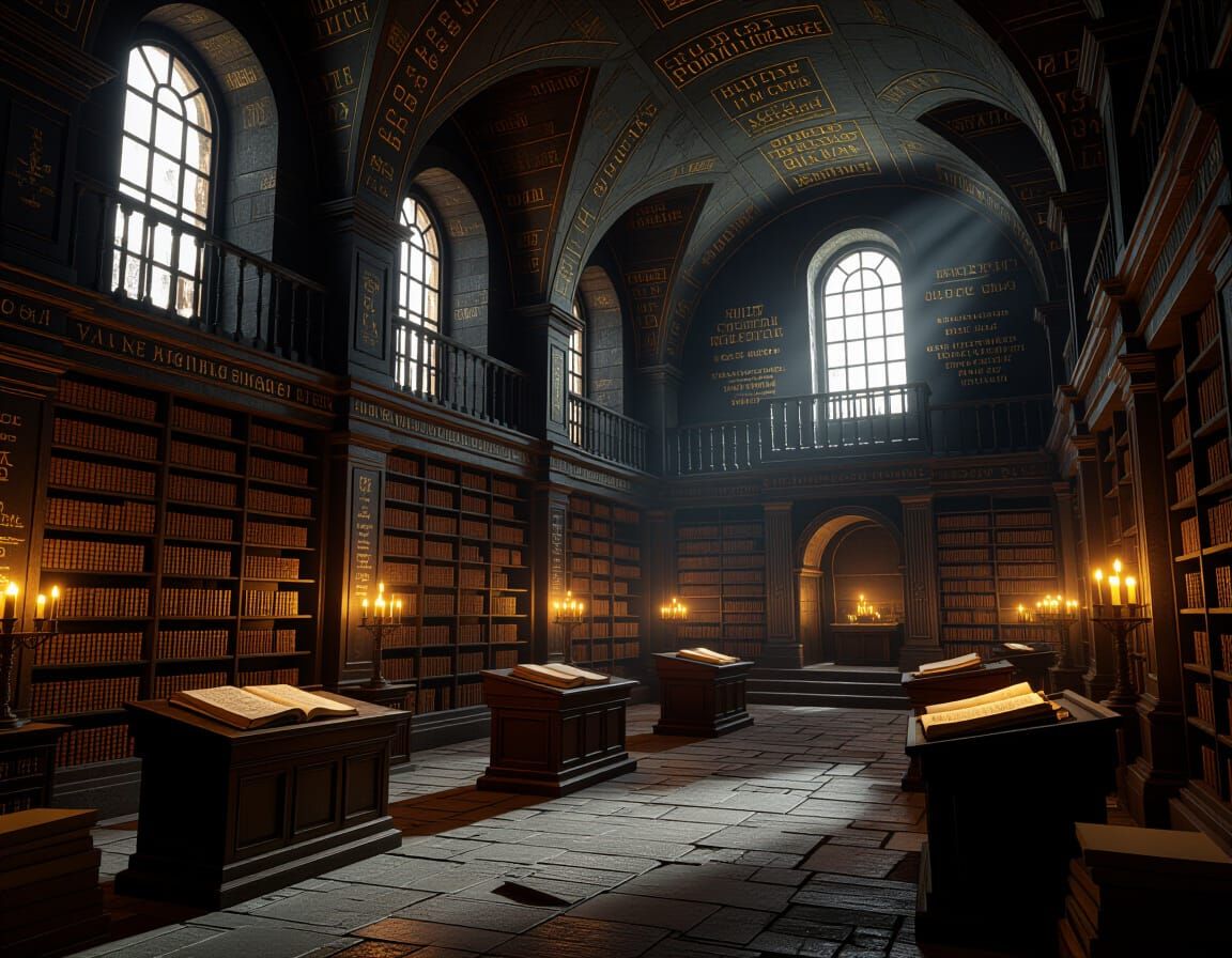 This image shows an ancient underground library within a hidden tomb. Thousands of books line the shelves, illuminated by candles and flickering torches, creating a mystical atmosphere in cinematic lighting.