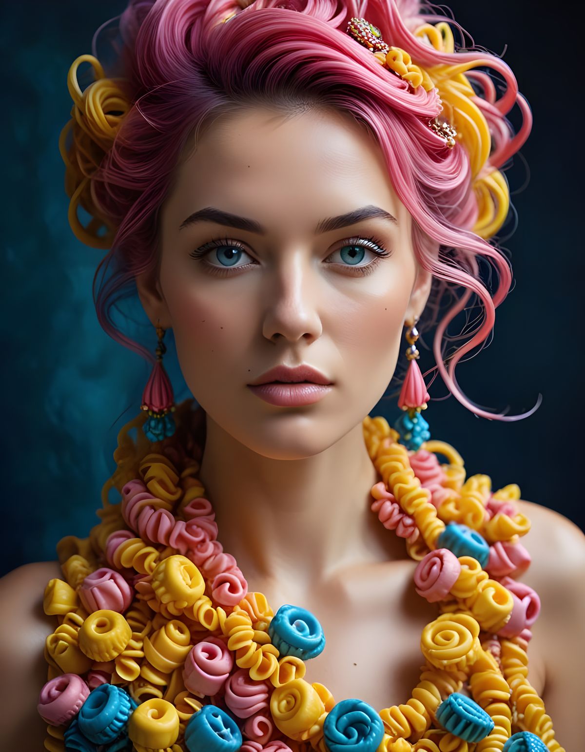 A striking picture of a woman adorned with colorful macaroni. The pasta resembles ornate jewelry, draping her shoulders in vibrant pinks, blues, and yellows. The image blends elegance and whimsy.