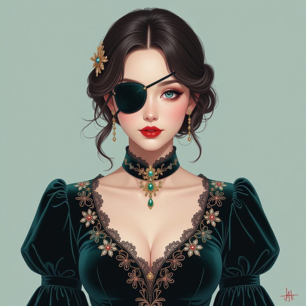 This image shows a beautiful one-eyed woman in a luxurious, embroidered velvet dress. The photorealistic image features delicate textures and lighting, with meticulous attention to detail.