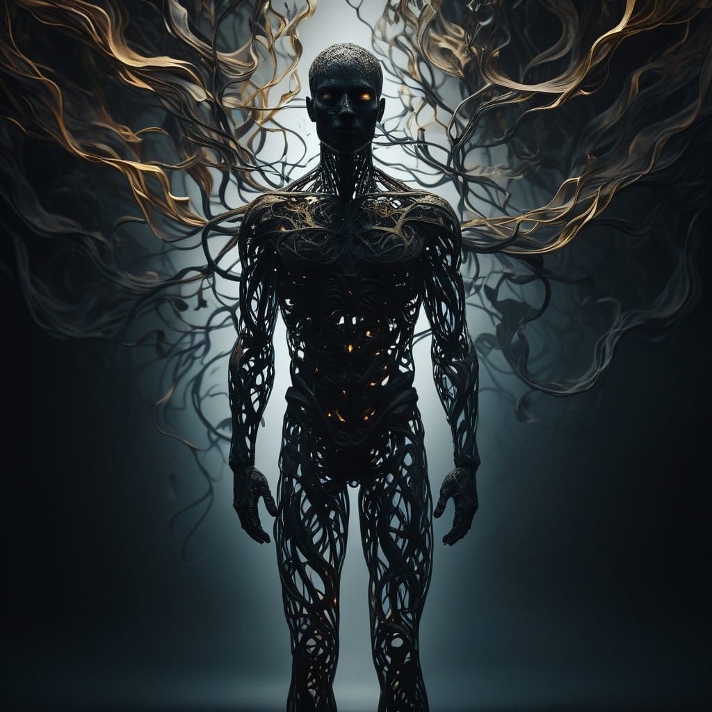 This artwork depicts a human form made of translucent layers, symbolizing inner emotions and memories. Moody tones and dramatic lighting create a mysterious, thought-provoking atmosphere.