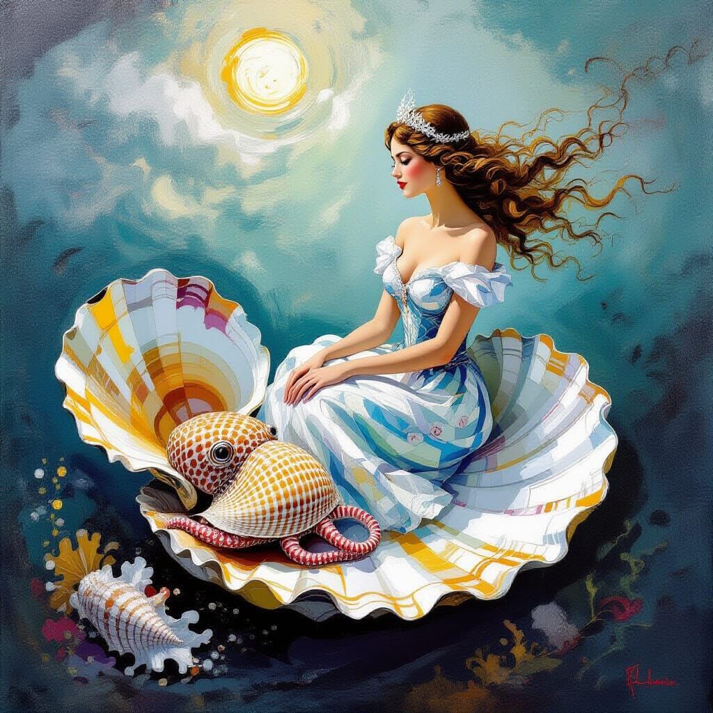 A mermaid with shimmering scales swims with a fluid octopus and scallop shell amidst colorful seaweed. The artwork features a matte background with oil-like color blending, evoking a surreal, modern aesthetic.