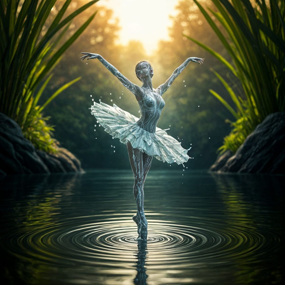 This image shows a delicate water formation resembling a ballerina in the center of a serene lake, evoking a sense of enchantment and wonder.