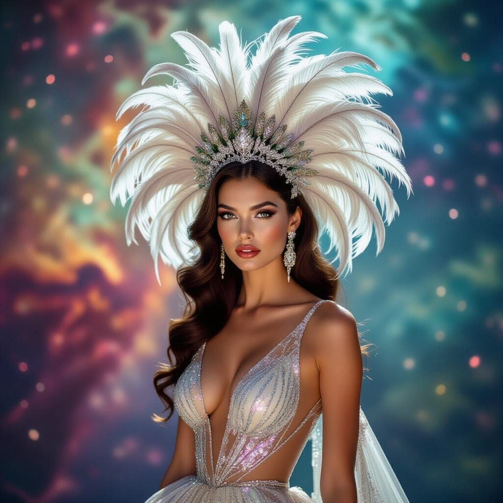 A striking picture of a woman in a feathered headdress and sequined gown, set against a cosmic background. The image evokes the elegance of 1950s haute couture with art deco influences.