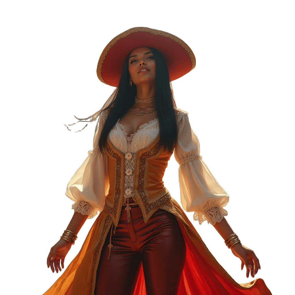 This image features a charming woman in 17th-century musketeer attire, dancing on a vibrant danceball in a sun-drenched courtyard, surrounded by ornate Baroque architecture, blending elegance and playfulness in a futuristic, high-energy scene.