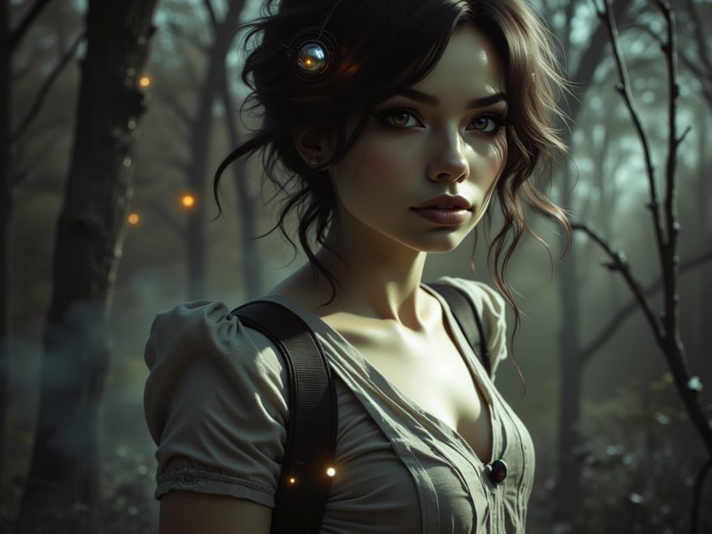 A full body portrait of a pleasant, youthful mad scientist woman with bold lines and deep contrast. Features dramatic lighting reminiscent of Turner's style.