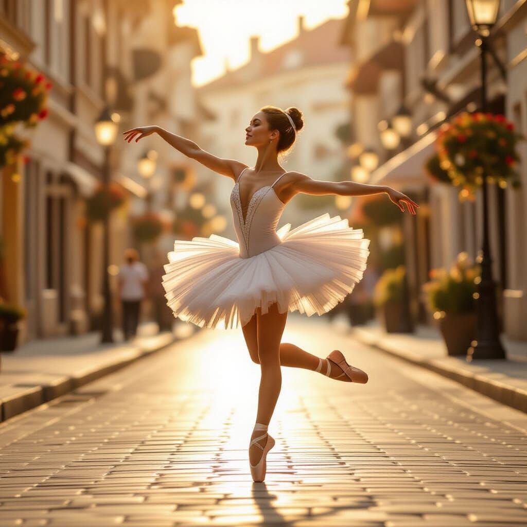 A vibrant image shows a ballerina leaping against a sunlit street. Golden light illuminates her form with intricate detail. The artwork has painterly qualities and a luminous aesthetic.