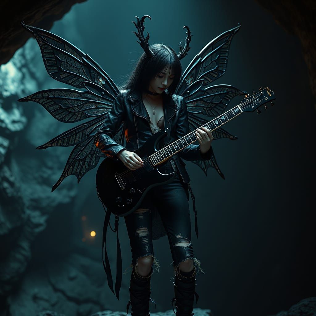 This image shows a rocker fairy with metal wings playing guitar in a cave. The character design has a dark romantic aesthetic with surreal and gothic elements.