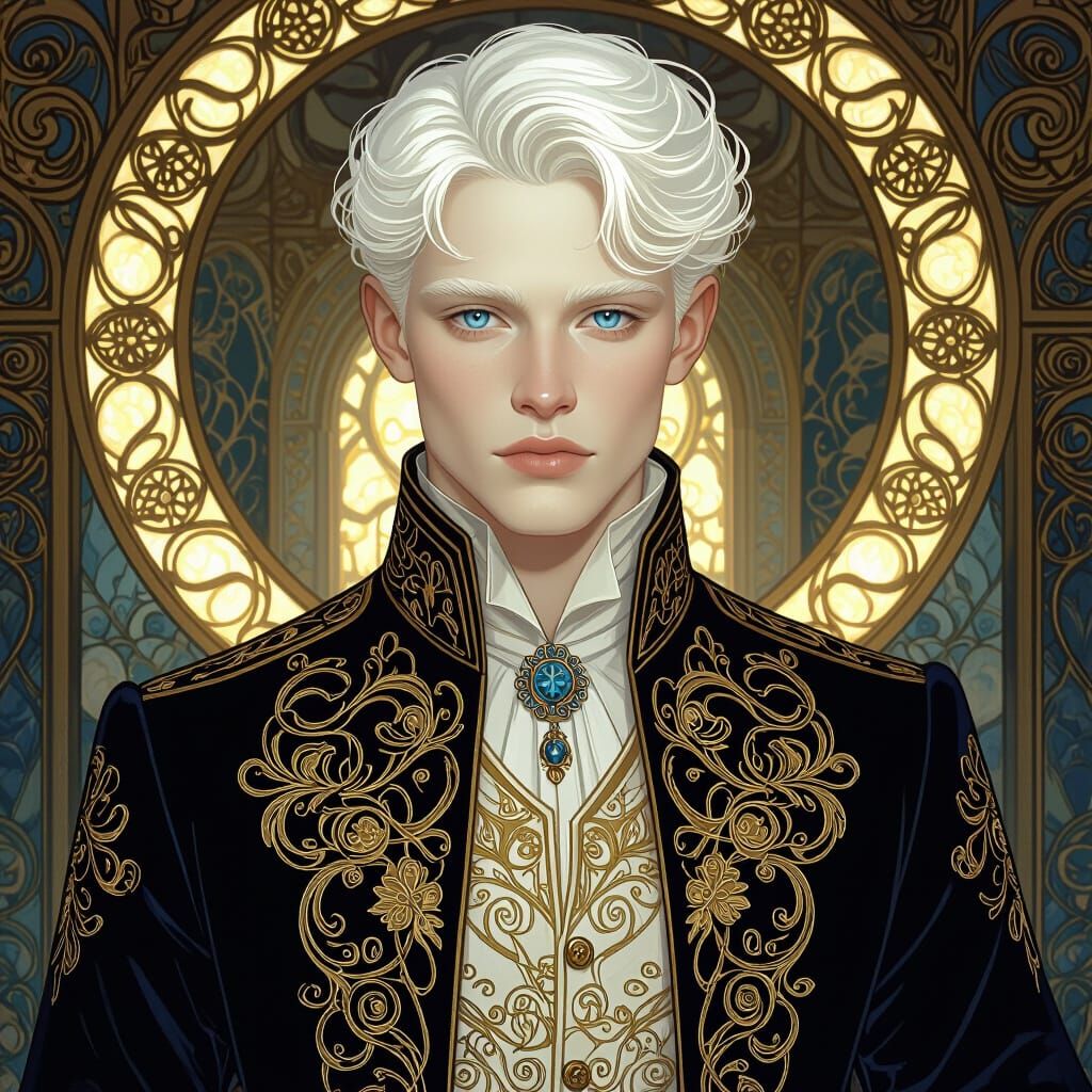 This image showcases an albino young man with striking blue eyes, adorned in ornate royal attire. The scene features intricate patterns and soft, atmospheric lighting.