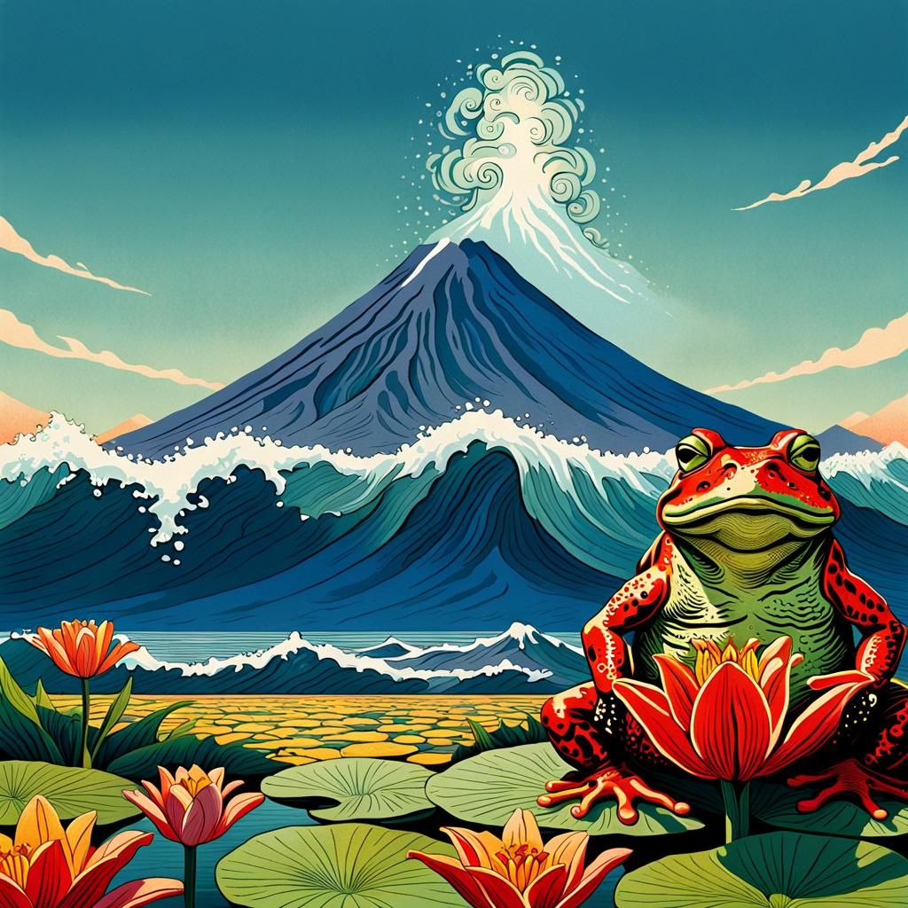 A retro woodcut illustration of a large frog sitting on a lily pad, with a highly detailed wave in the foreground. Mount Fuji is visible in the distance, rendered with bright colors.