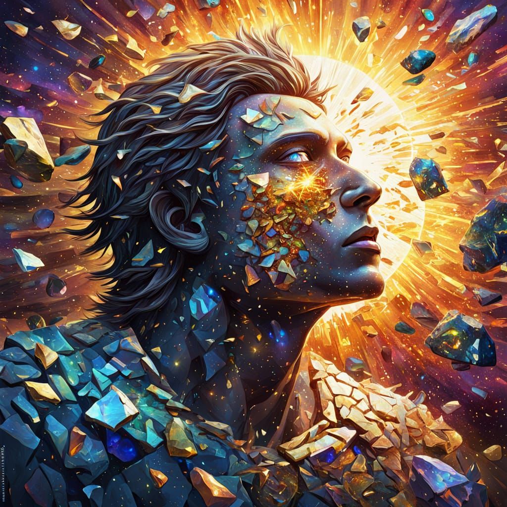 A vibrant oil painting showing a person being torn apart by stones, their fragments floating towards the sun. The image has a glowing astral aura in a shimmering, ethereal style.