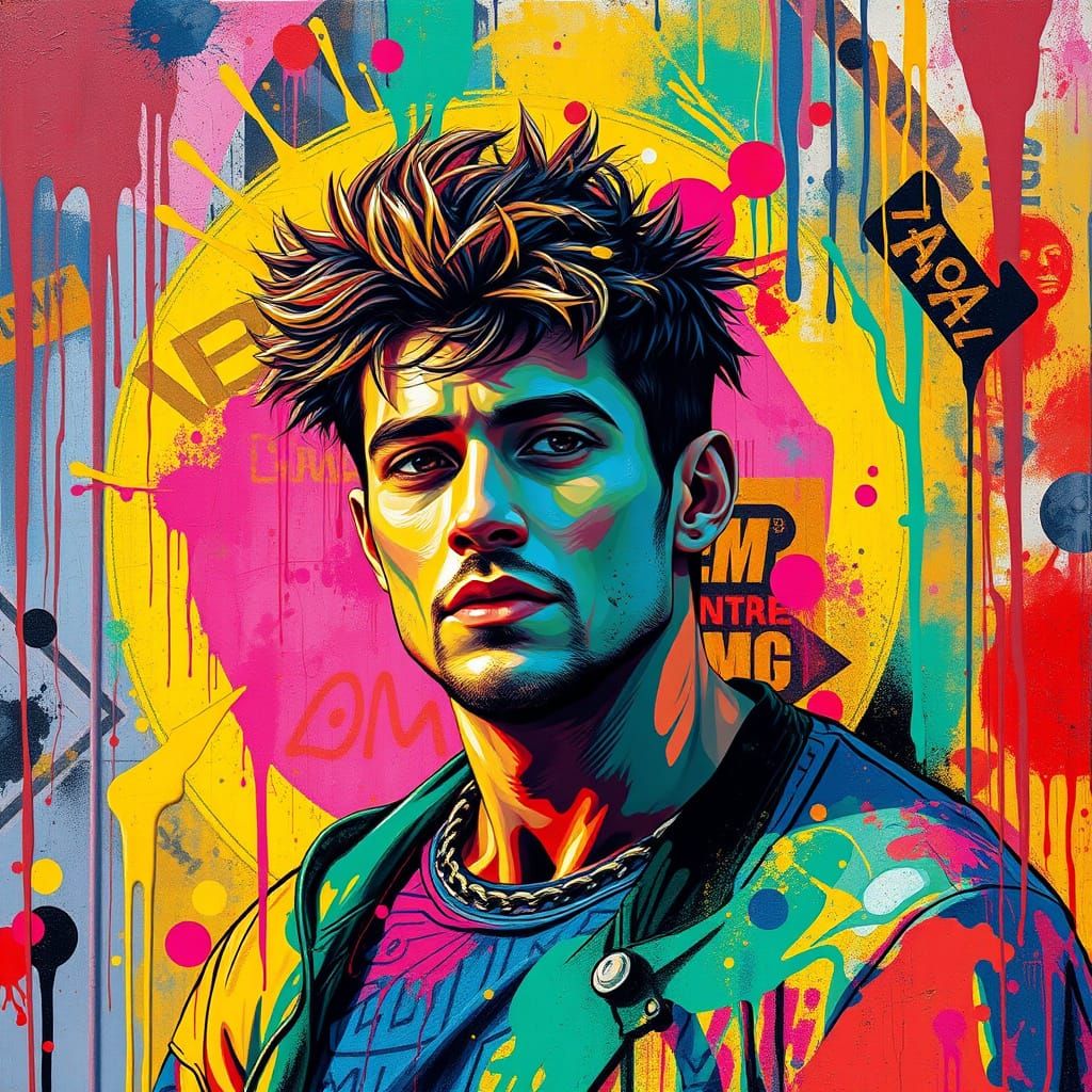 This image depicts a dynamic street artist amidst a swirling vortex of color and texture, blending graffiti, splash, and street art in a high-contrast, polychromatic scene with bold, acrylic textures.