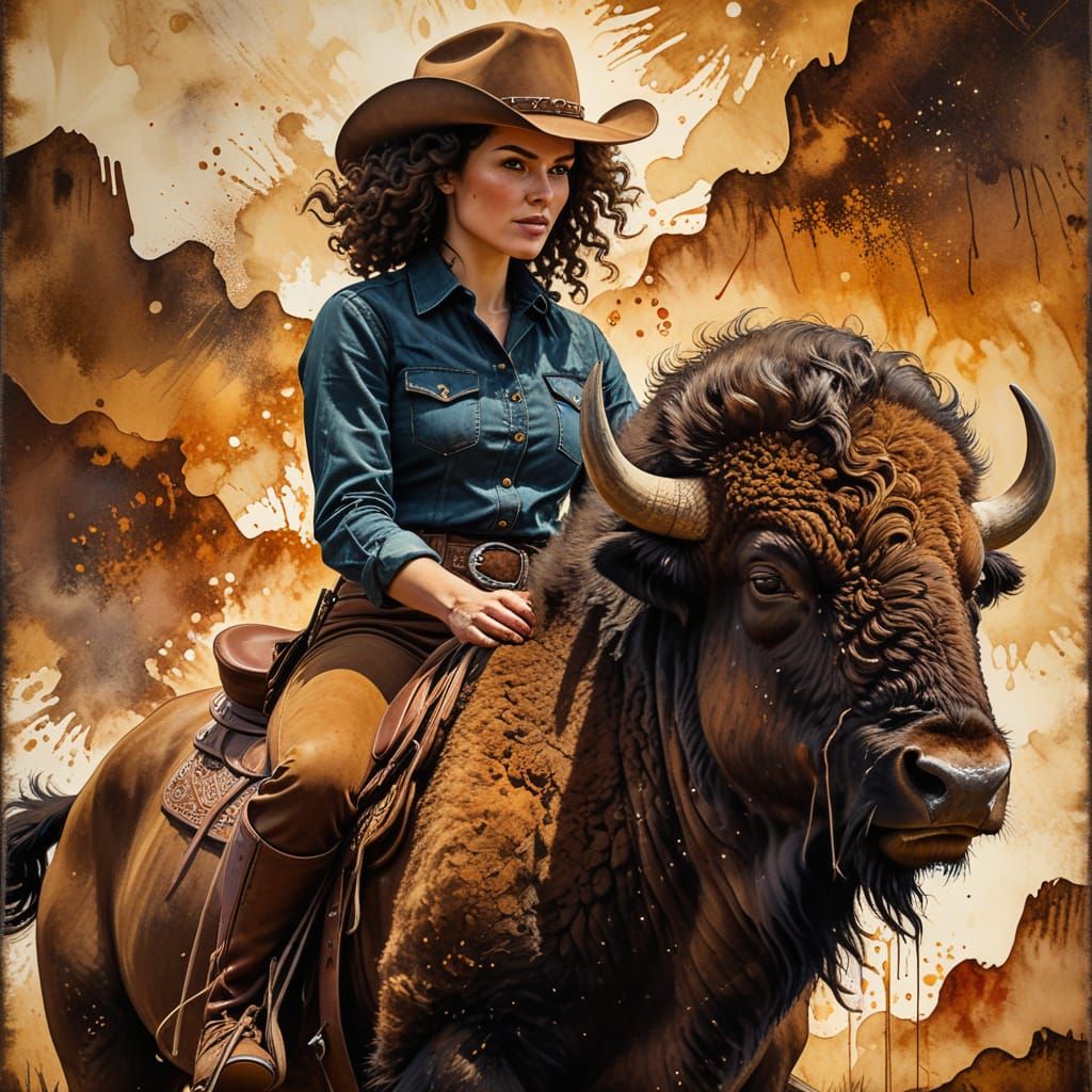 A charming, high-quality image of a cowgirl riding a bison, created in a vintage poster style with warm golden lighting and intricate details.