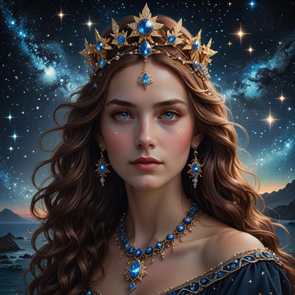 This image shows a close portrait of Taygete, the Guardian of Sailors. She has long wavy red hair, chocolate eyes, and wears a stars-inspired dress with blue gems and golden jewelry against a magical night sky.