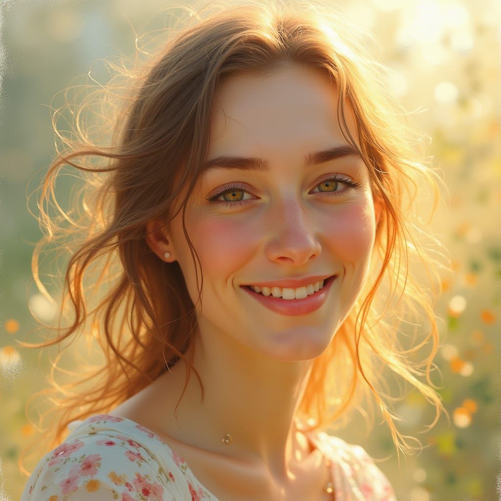 A warm and inviting portrait of a serene woman surrounded by soft morning light, capturing the quiet joy and delicate beauty of a peaceful moment.