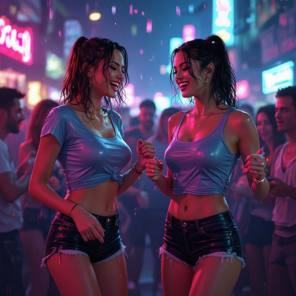 This image depicts two women in wet t-shirts, participating in a contest. The scene features dramatic lighting and neon hues, creating a futuristic, noir-inspired aesthetic.