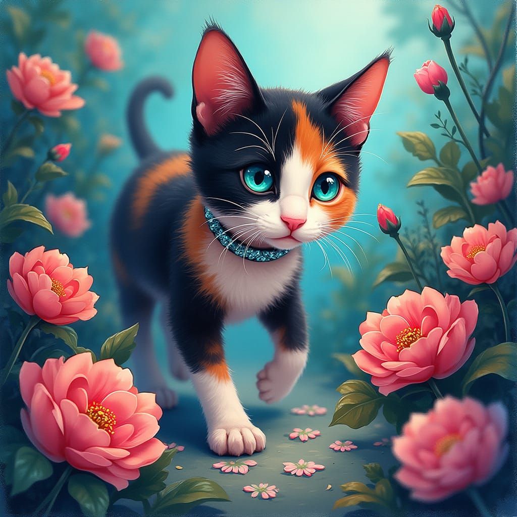 A vibrant image of a calico cat with teal eyes in a lush garden. Glowing paw prints mark its path through blooming flowers in blended watercolor textures, with bold edges and a graffiti art style.