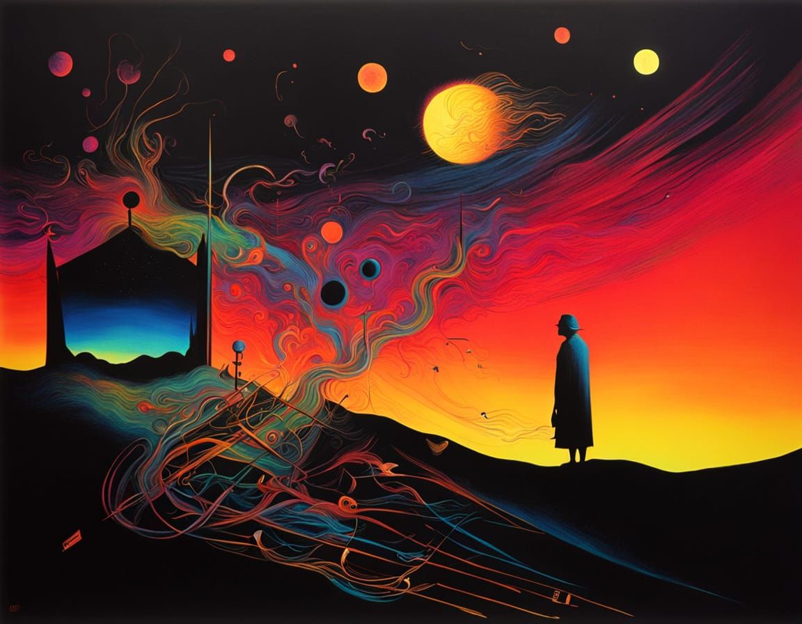 This image shows an abstract minimalist musical scene with surrealist and techno elements. The artwork features airbrush techniques, blacklight neon accents, and gilded obsidian details.