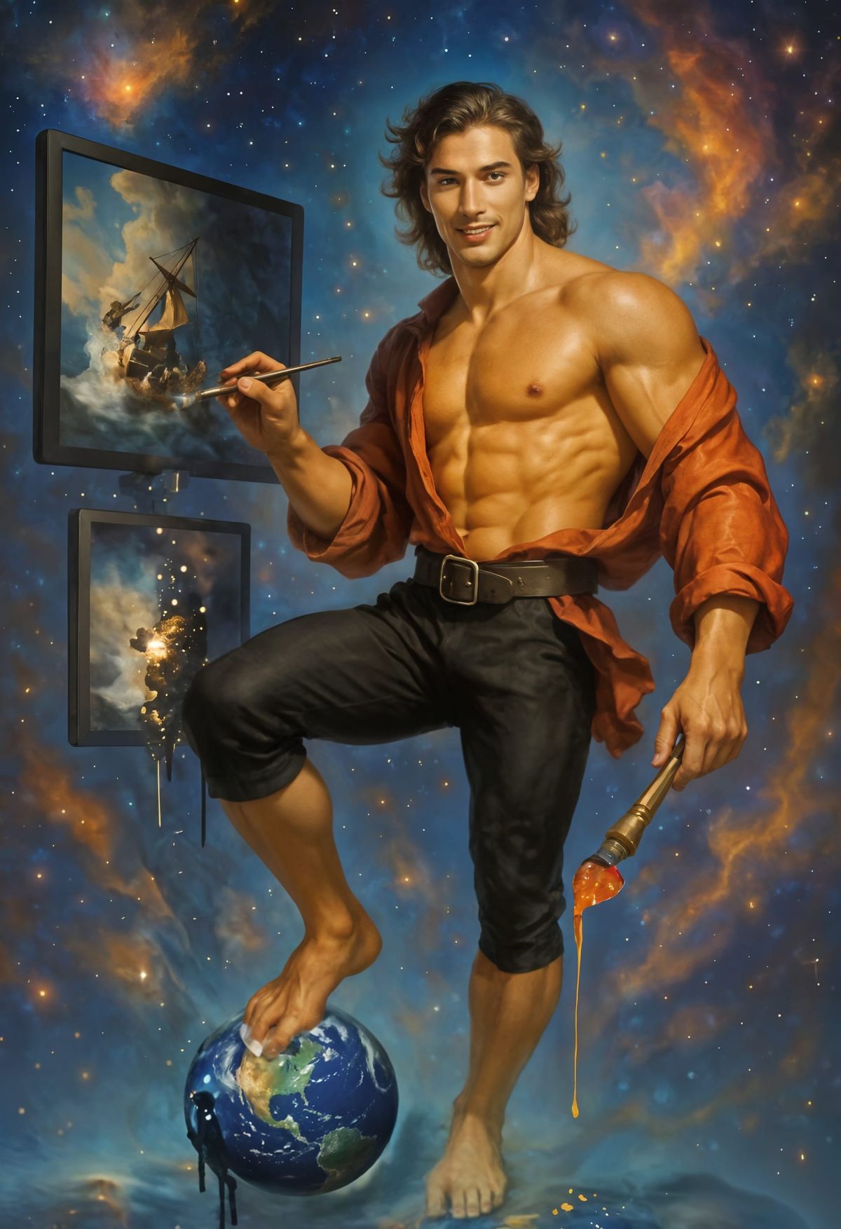 This image captures a mesmerizing scene of paint dripping off a brush, creating a waterfall of colorful paint mixed with glowing stars, in a 3D textured effect