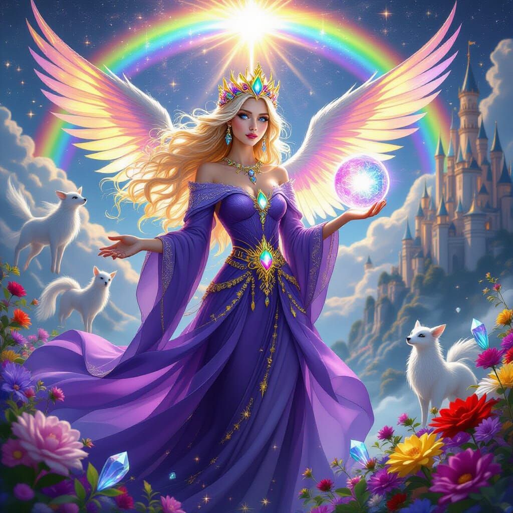 This image shows a radiant sorceress with flowing hair and a gemstone crown, rising like a phoenix in a cosmic fantasy style. She is surrounded by crystal gardens and mystical animals with golden feathers.