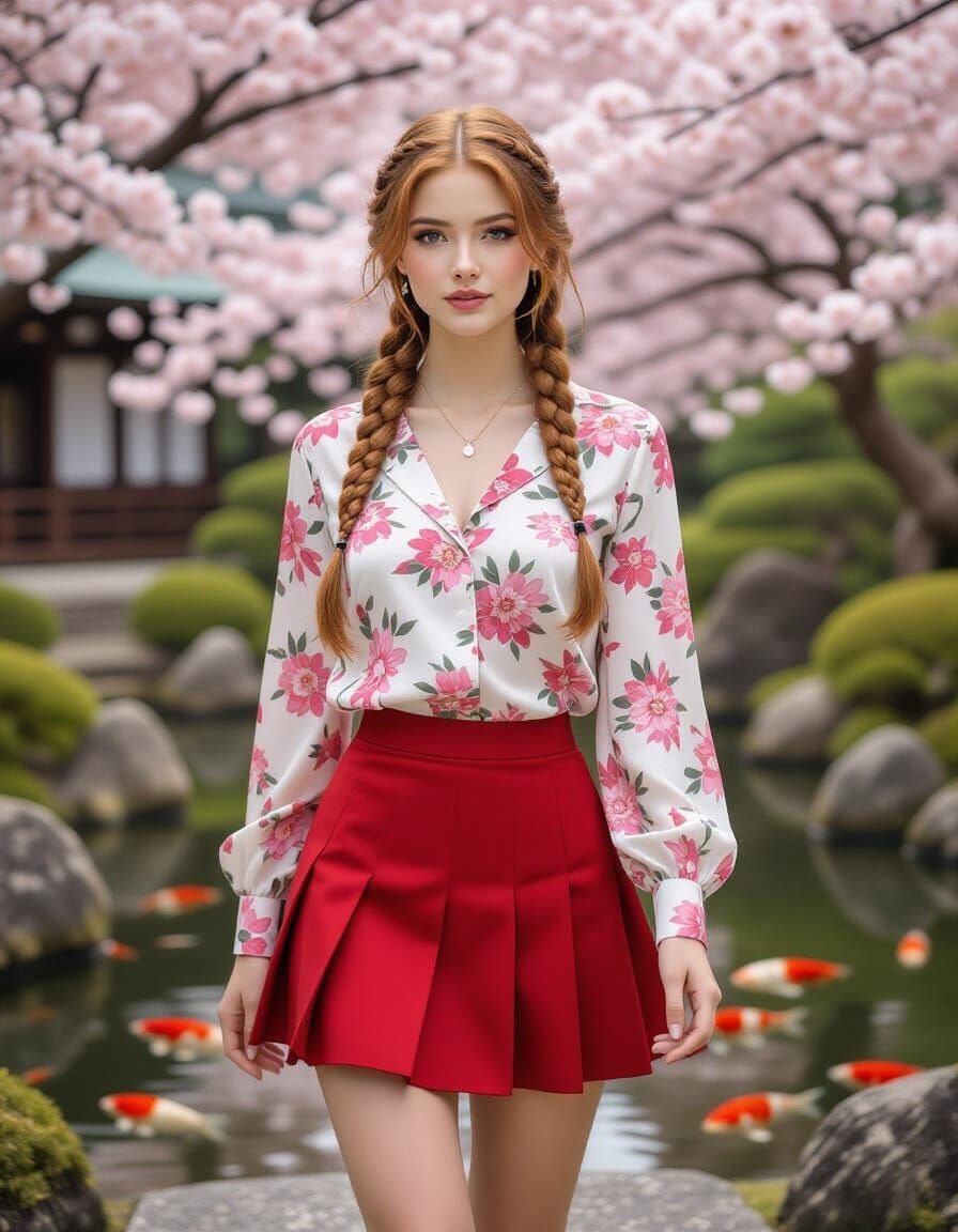 This image shows a beautiful young woman with braided auburn hair walking through a peaceful Japanese garden. She is wearing a floral blouse and red skirt, near a koi pond and cherry blossoms.
