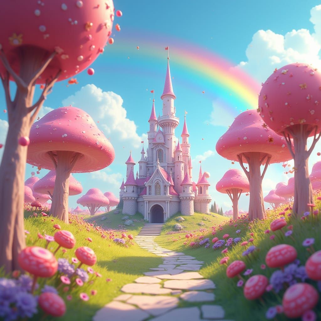 This image shows a vibrant fantasy landscape featuring a crystal castle, lollipop trees, giant mushrooms, and flowers under a rainbow. The scene is rendered as 3D cartoon art.