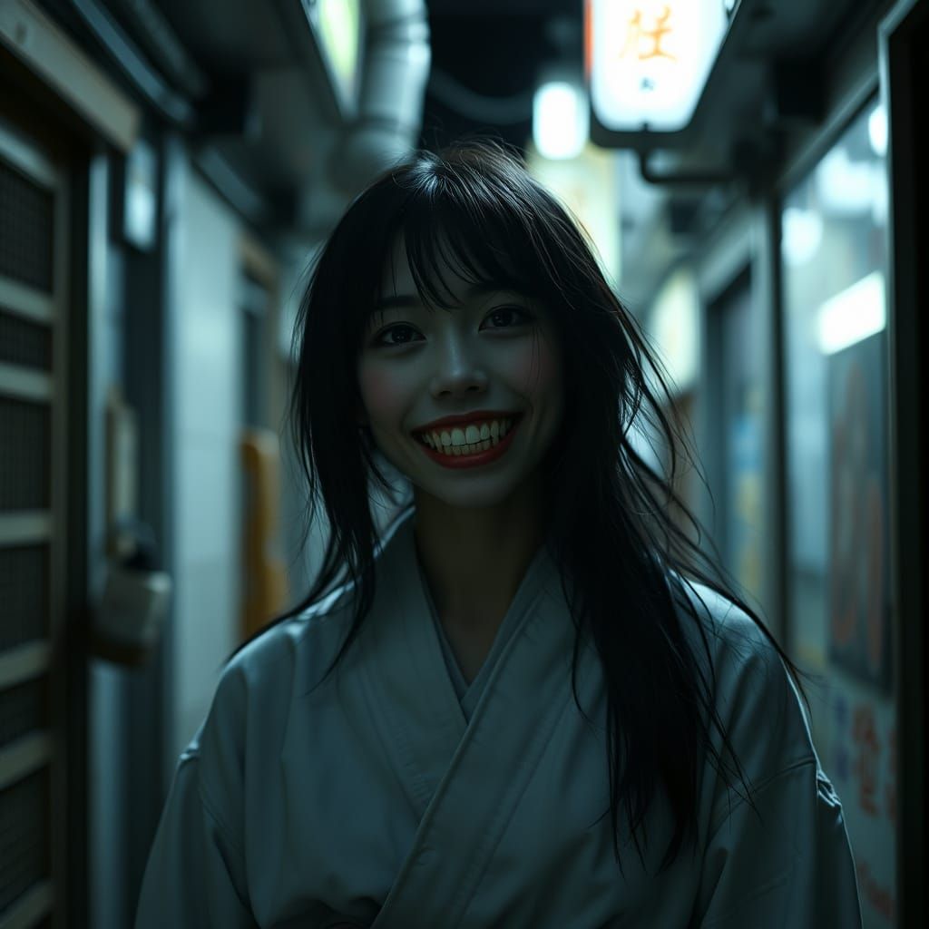 This image shows a ghostly woman in a dark alley, illuminated by fluorescent lights. She has a sinister smile, reminiscent of a Noh mask, rendered with hyper-detailed horror art elements.