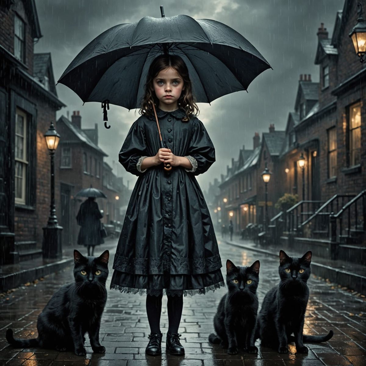 This illustration depicts an eerie young girl in a vintage dress holding an umbrella amidst black cats. The scene evokes a mysterious, unsettling mood with a moody, dark, and rainy atmosphere.