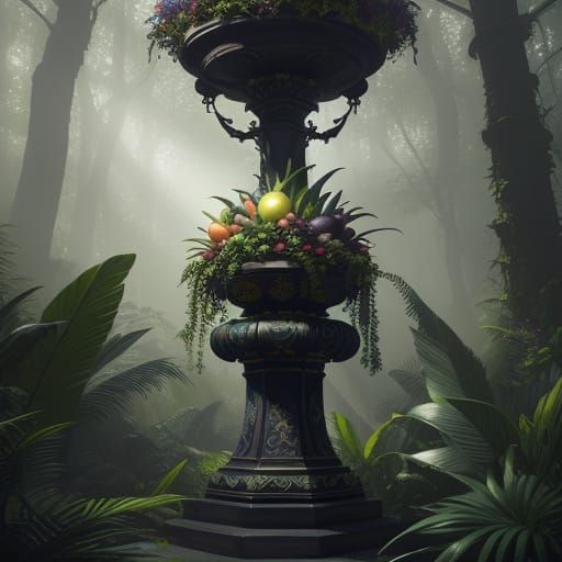 This image features a stunning still life of exotic fruits on a glowing pedestal in a mystical forest, reminiscent of fantasy concept art. Rich colors, intricate details, and cinematic lighting create a hyper-realistic scene.