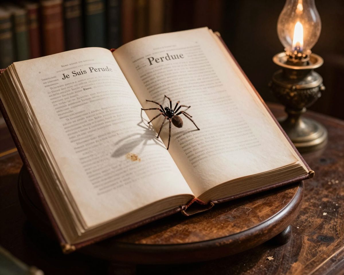 This image depicts an old French book titled 'Je Suis Perdue' resting on a stand in a dimly lit 1850 library. A spider on the book appears magnified by lamplight shadows, highlighting the aged page and stain.