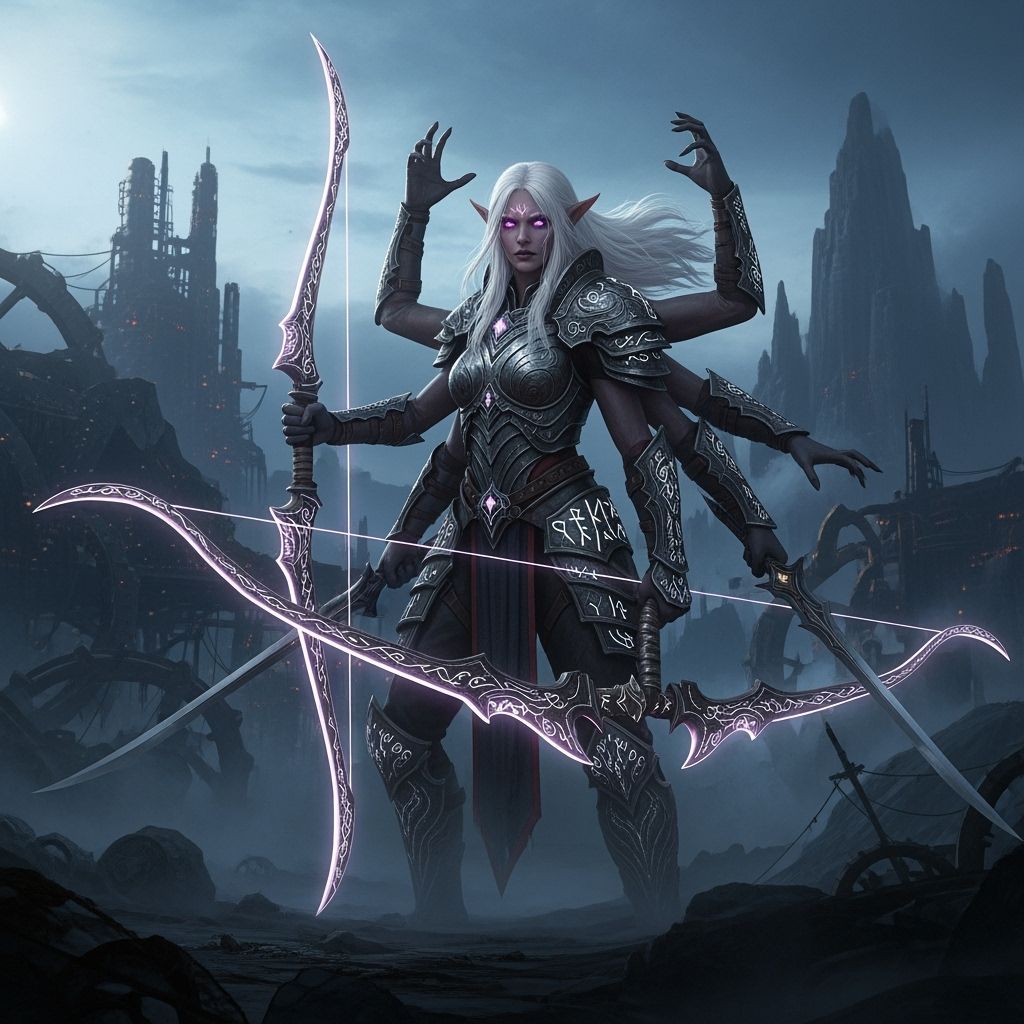 A striking picture of a four-armed albino elf warrior in a desolate, industrial wasteland. She is clad in dark, runic armor, rendered as digital art in a dramatic, cinematic style.