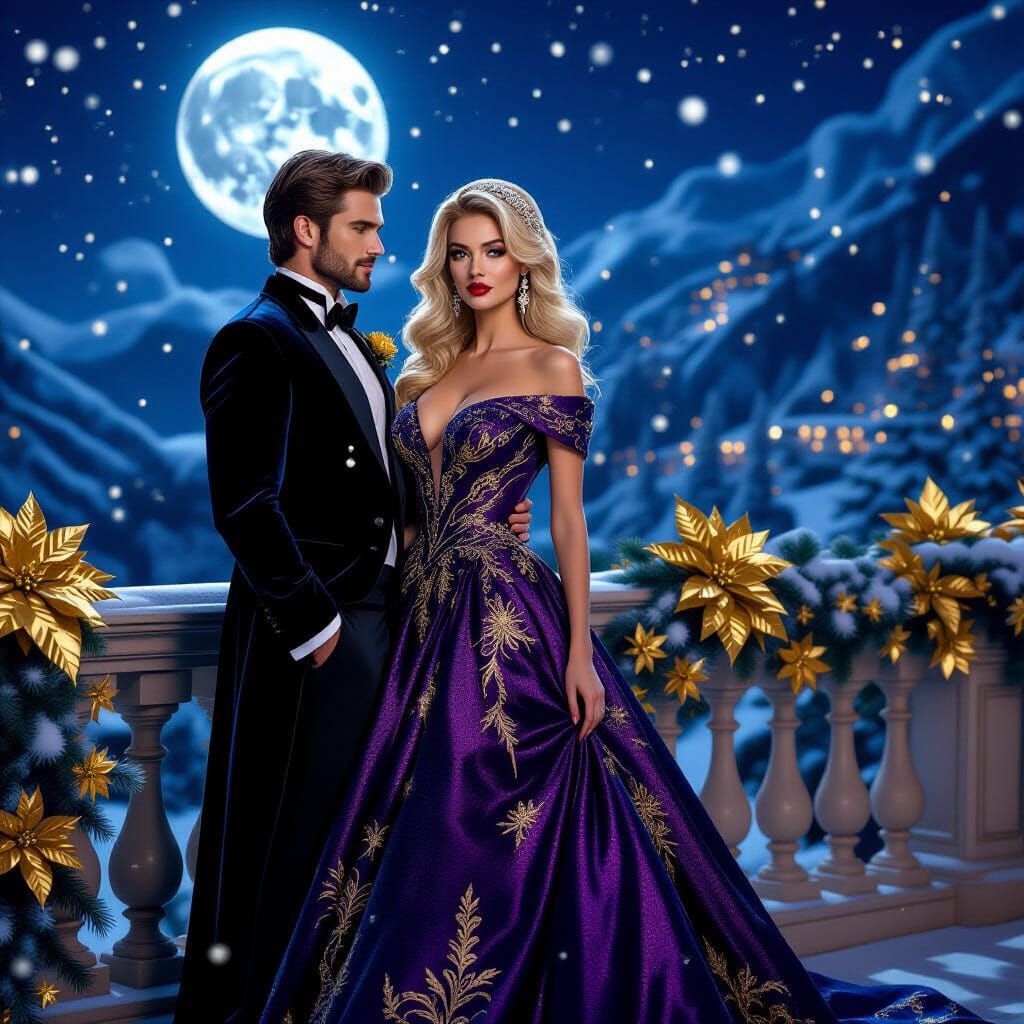 Glamorous blonde woman in an amethyst gown with gold accents, red lips shining under silver moonlight beside a man in a dark velvet suit. Balcony adorned with golden poinsettias and soft snow ,regal holiday magic.