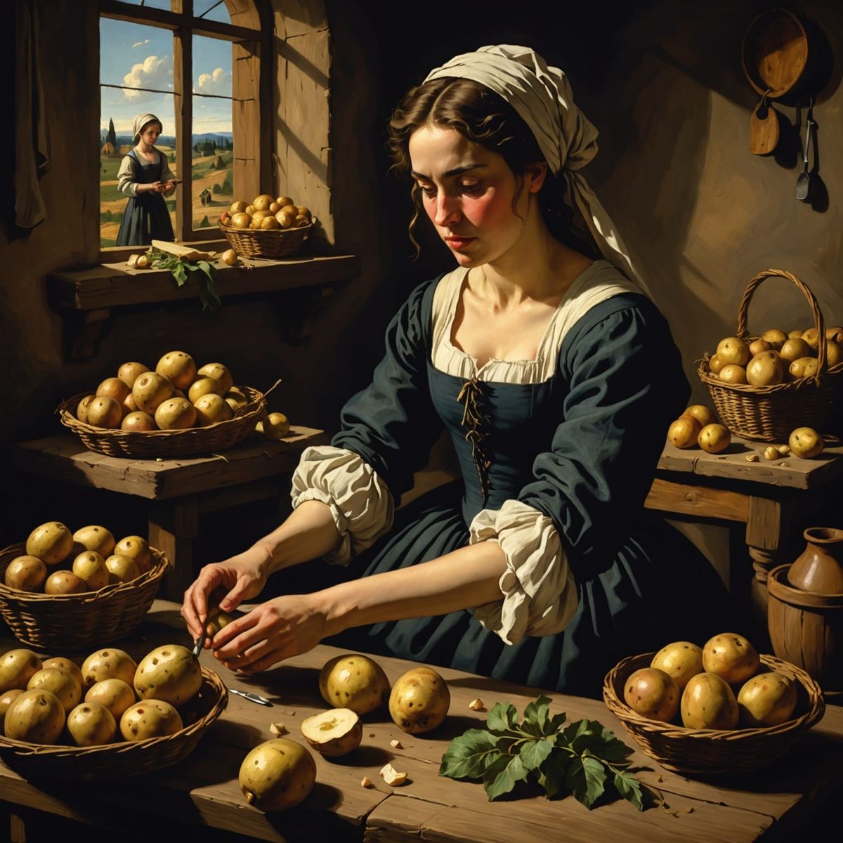 This image shows a peasant woman peeling potatoes at a table. The artwork employs chiaroscuro and tenebrism techniques in a baroque aesthetic to create dramatic lighting.