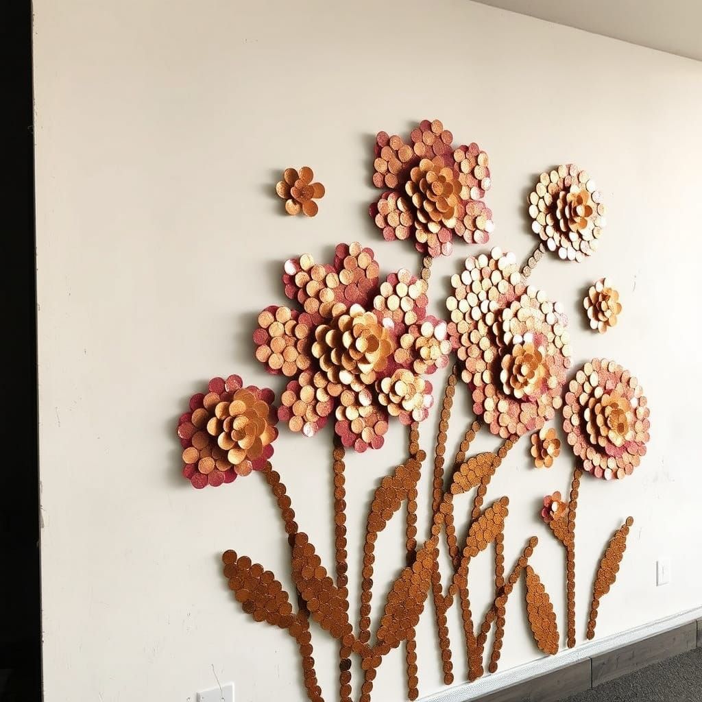 This image showcases a creative wall mural featuring flowers meticulously crafted from numerous pennies, offering a unique artistic display.