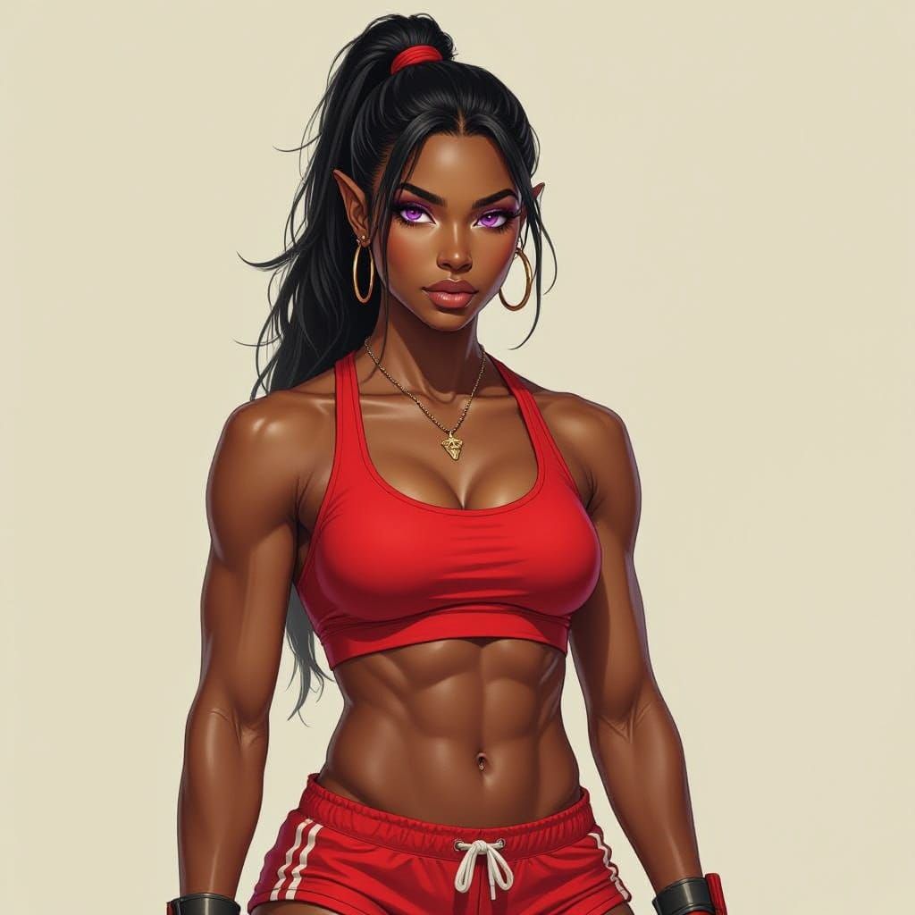 This image showcases a powerful drow female with striking purple eyes, set against a colorful background. The artwork features intricate details and a dramatic lighting effect.