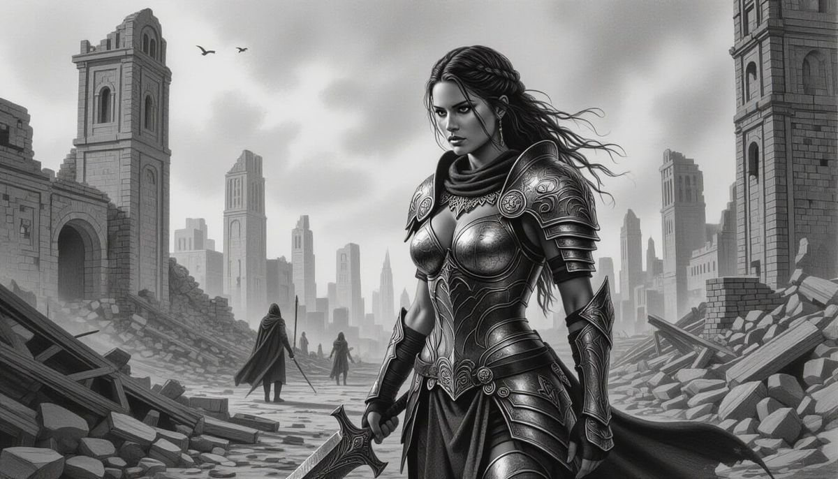 This hyperdetailed charcoal drawing shows a female warrior searching for someone amidst a ruined city, shedding her ornate armor as she goes.