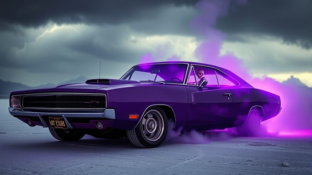 This image shows a sinister purple 1969 Dodge Charger lowrider, haunted by a glowing skeleton driver. Methane flames and smoke fill the scene, set against a stormy salt flat backdrop.