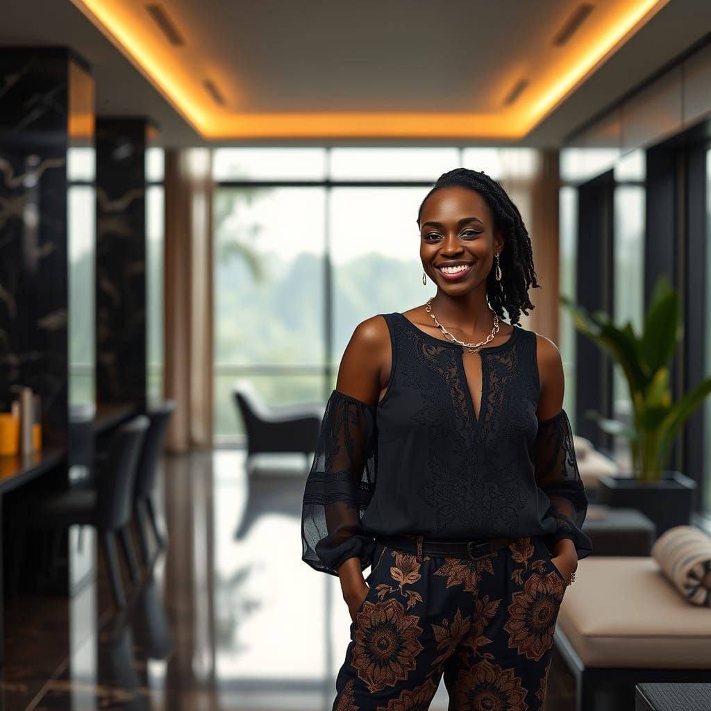 A striking photo of a Black woman in streetwear with unique prints, set in a modern hotel. The scene features obsidian walls, a rainforest view, and nuanced lighting reminiscent of cinematic photography.