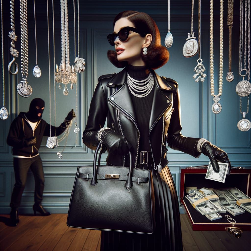 This image depicts a daring heist in a luxurious setting, with a woman clad in black leather and diamond jewelry, confidently leaving a mansion with a designer handbag overflowing with stolen jewels and cash.