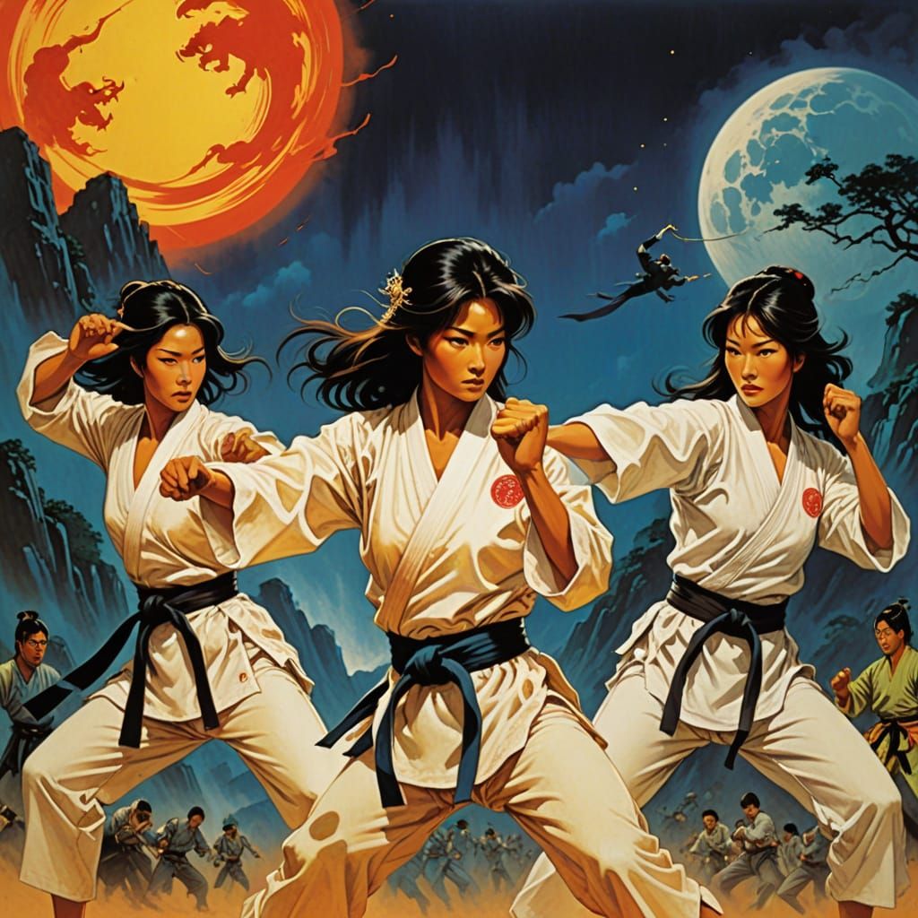 A dramatic film poster of an epic karate battle between beautiful tanned women. The women wear sleeveless white outfits in this image created in the style of 70s fantasy art.