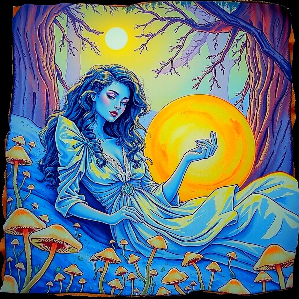 This image shows a beautiful woman in a diaphanous gown reclining in a field of glowing mushrooms. The soft light illuminates her porcelain skin and curly hair in this romantic illustration.