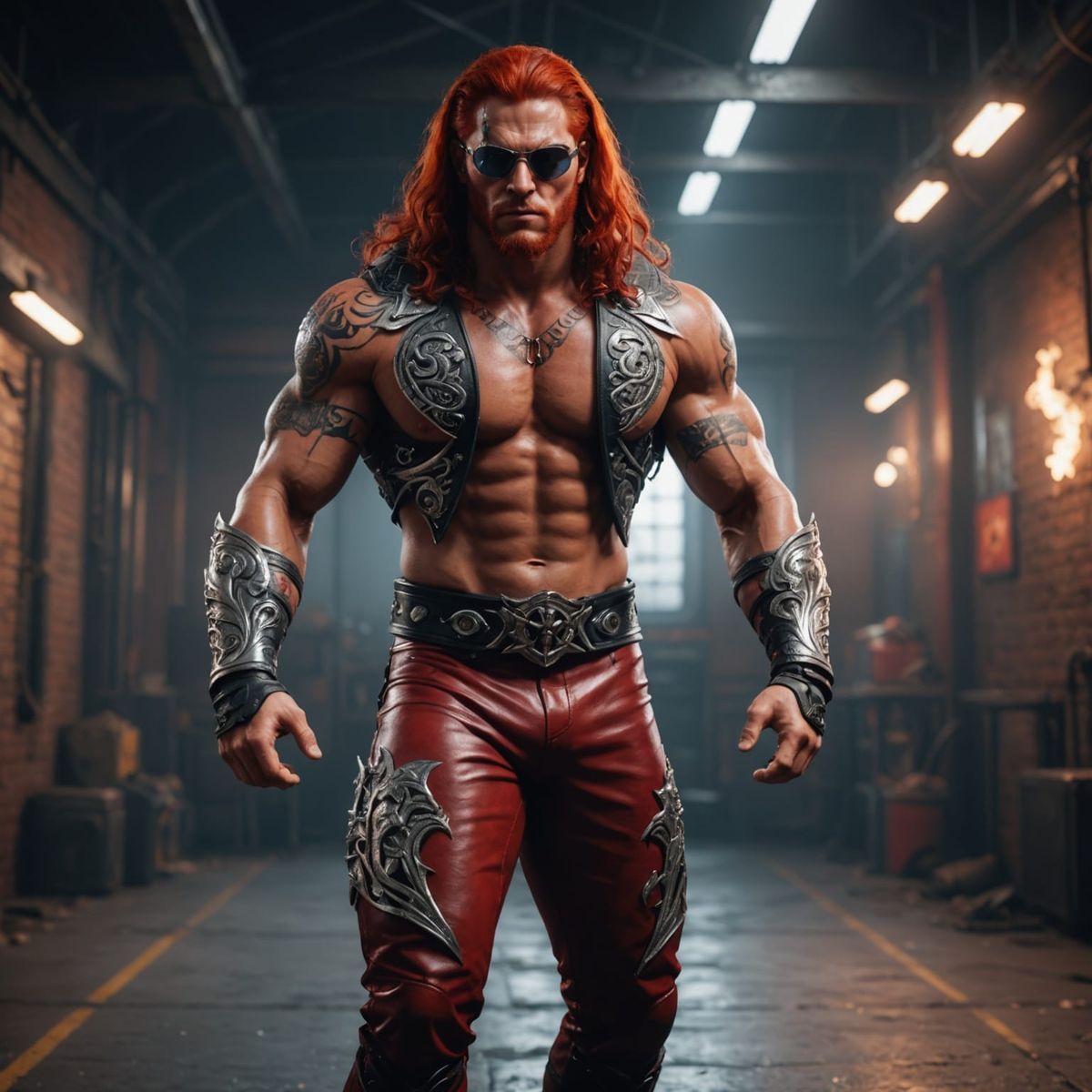 This image shows a demonic male wrestler with long red hair and intricate tattoos, wearing silver mirrored sunglasses and a bold red leather outfit. The 3D game cinematic feel and epic graphics create a striking visual effect, with intricate details and dynamic lighting.