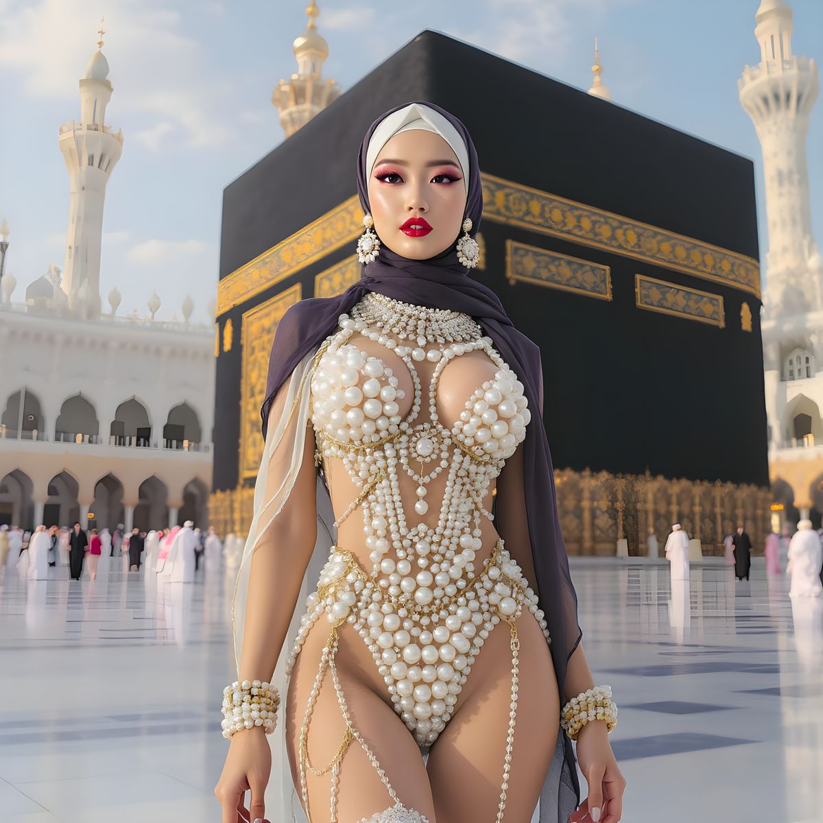 This image depicts an Asian woman wearing a pearl bikini and jewelry in front of the Kaaba. The artwork blends Islamic architecture with futuristic and luxurious elements in a Murakami-inspired style.