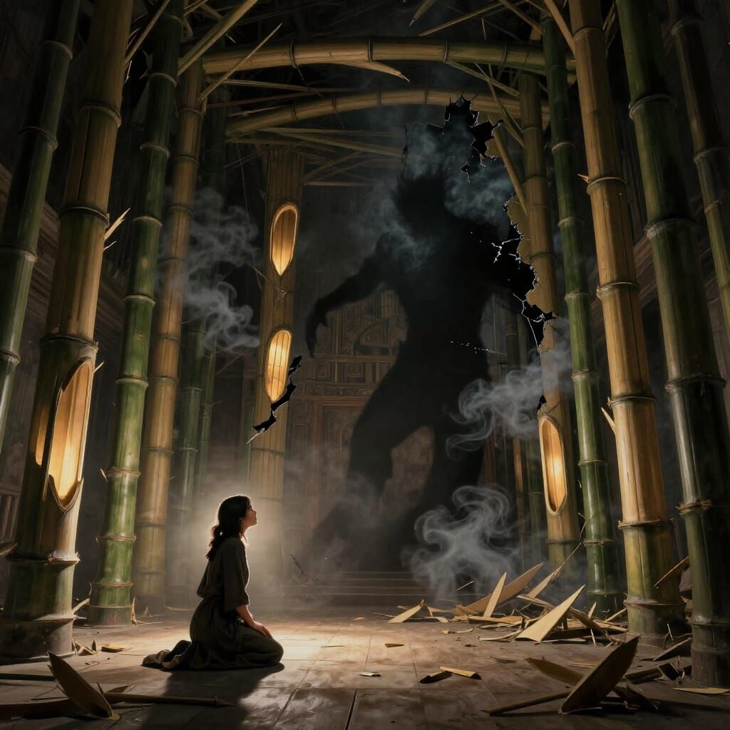 A woman kneels before a dynamic bamboo structure that twists and cracks, releasing dark smoke. Cinematic dark fantasy art with dramatic lighting and painterly texture.